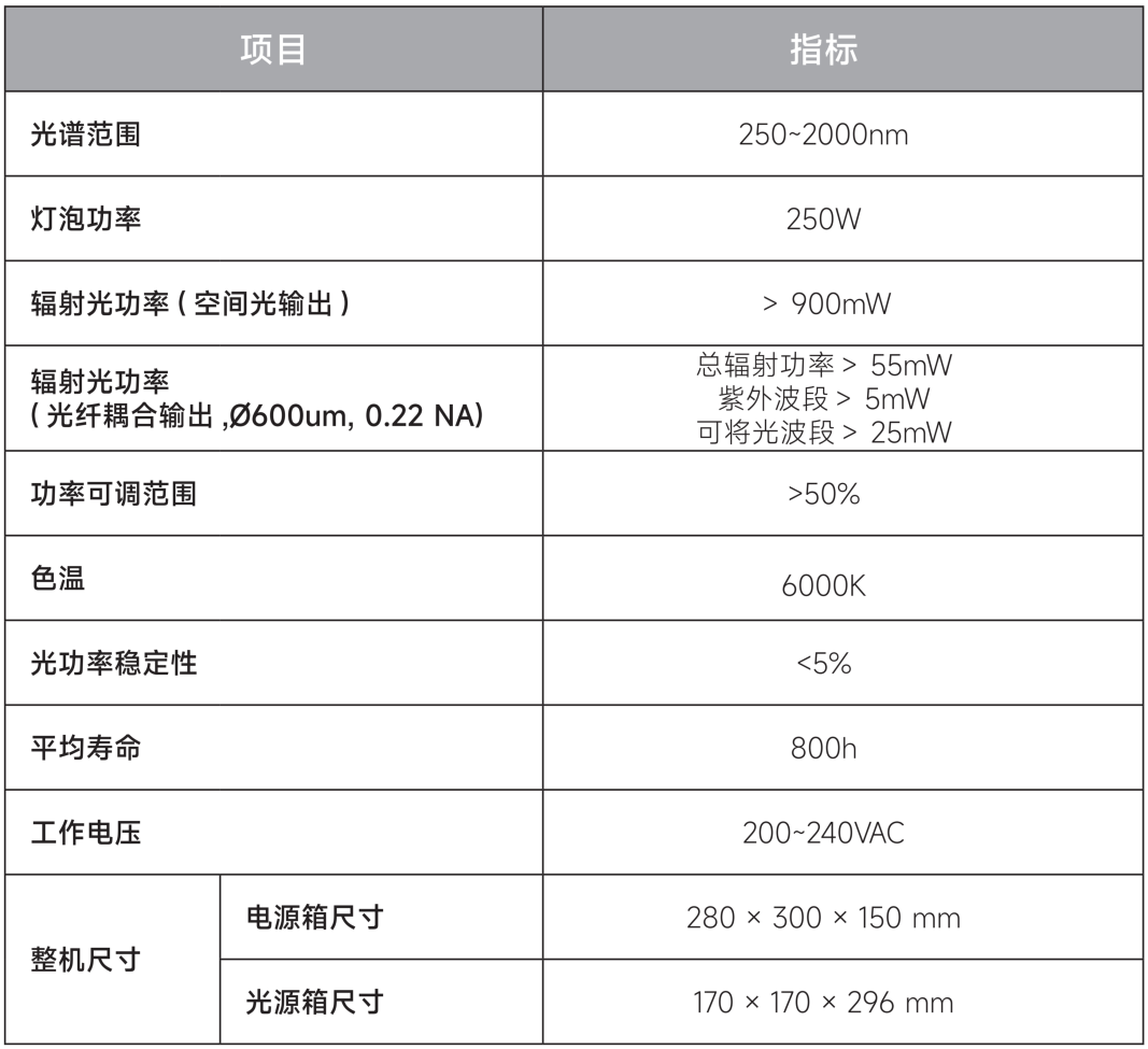覆盖紫外、可见、近红外,尤其紫外区辐射>5mW,满足光化学与荧光激发需求;