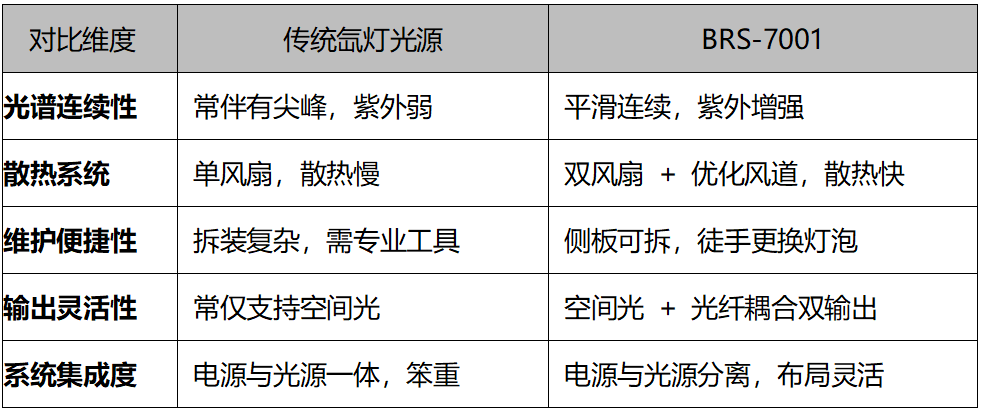 BRS-7001大功率氙灯光源凭借其宽光谱、高稳定、双输出、易维护等特性,已成为光化学、光电测试、太阳能研究、生物光照与光谱分析等领域中的理想选择。它不仅解决了传统光源在多波段、高功率、长时稳定方面的不足,更以模块化、用户友好的设计,助力科研与工业用户构建更可靠、更高效的光学实验平台。