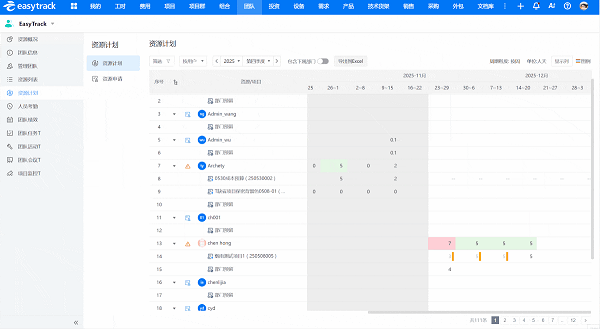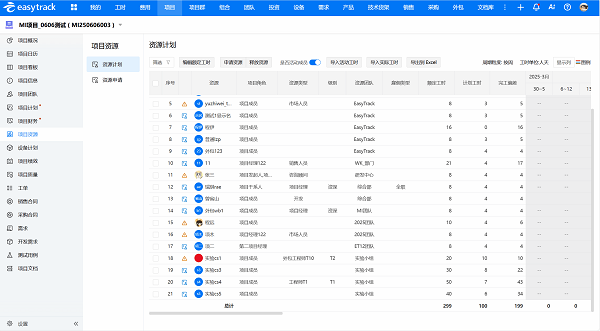 项目规划时,项目经理在易趋项目管理系统中创建资源计划,明确每个任务所需的资源类型、数量、能力要求及使用时间。系统会自动关联资源池,推荐匹配的资源列表。项目经理结合资源负荷情况提交资源申请,PMO审核通过后,资源即可正式分配到项目中。这个过程中,系统会自动校验资源是否冲突——如果申请的资源已被其他项目占用,会直接提示冲突信息,从源头避免“抢资源”问题。